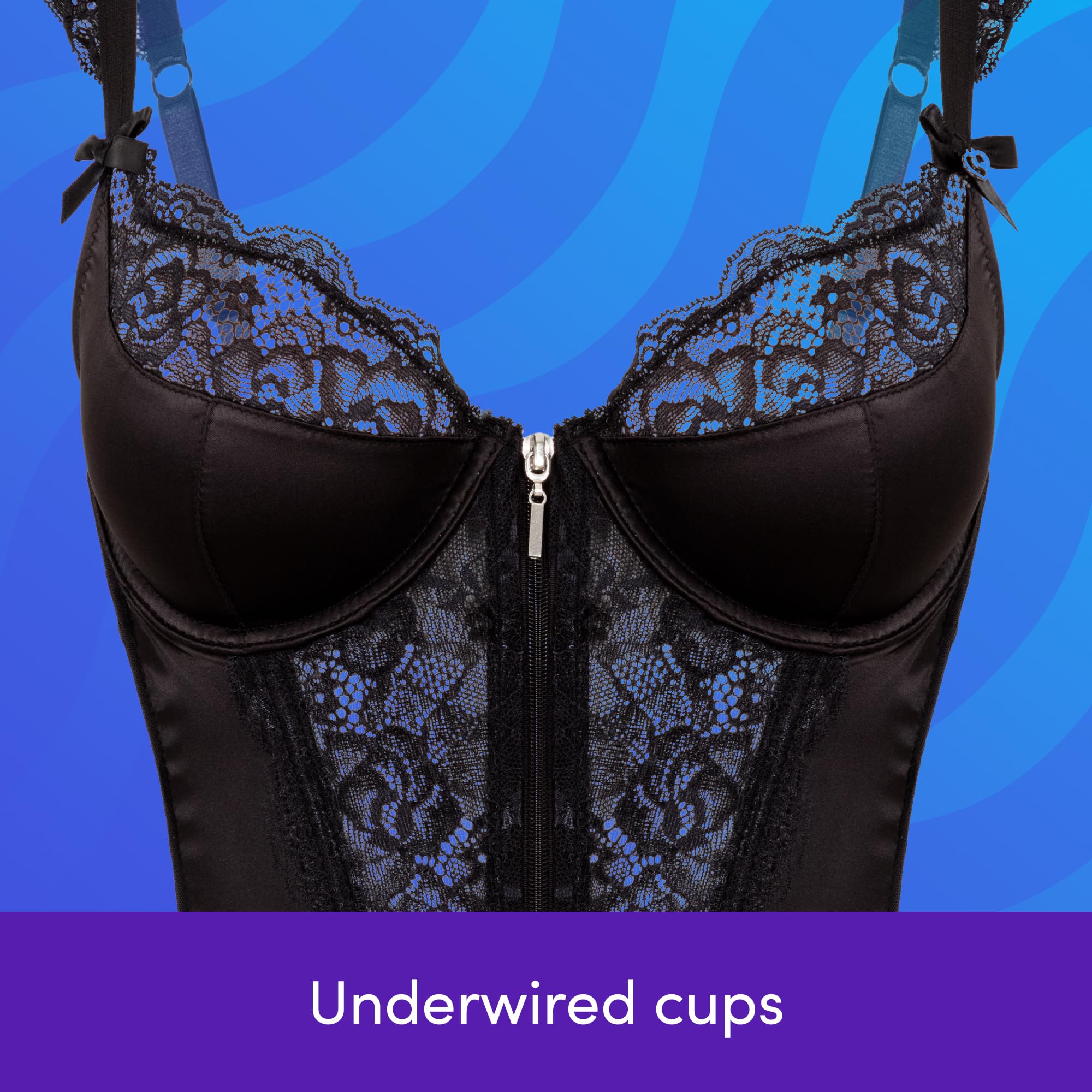 - Curve-flattering black zip-front lace and satin basque, underwired cups with floral lace trim provide boost and support