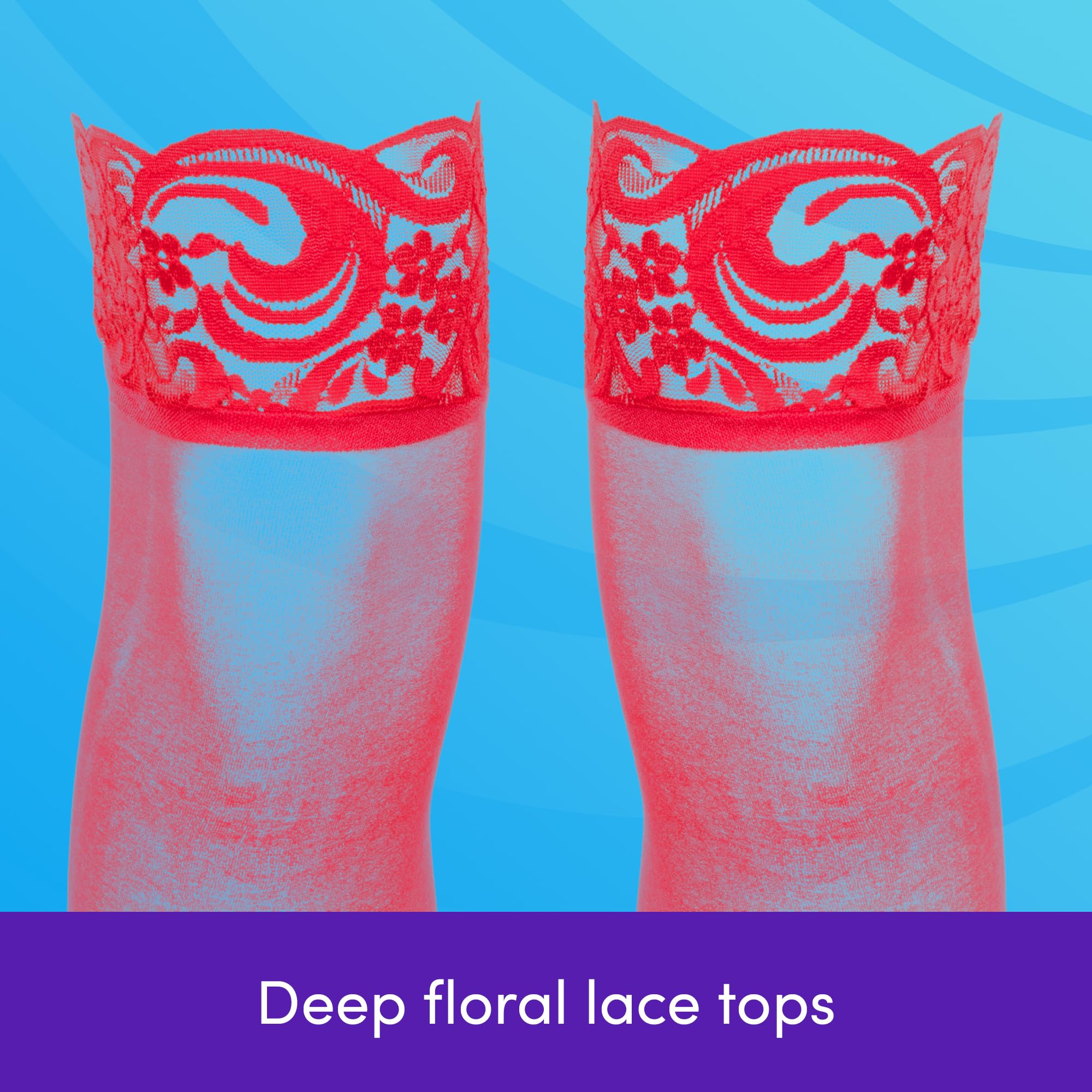 - SHEER THIGH HIGH STOCKINGS TO ACCESSORISE LINGERIE OR OUTFITS TO SHOW-STOPPING EFFECT: Say hello to pure style and seduction in an instant, with your new favorite stockings. Indulge in luscious, deep botanical lace tops that smooth over your legs in a gorgeously bold scarlet colourway for a sizzling, attention-grabbing look wherever you bare these thigh highs.