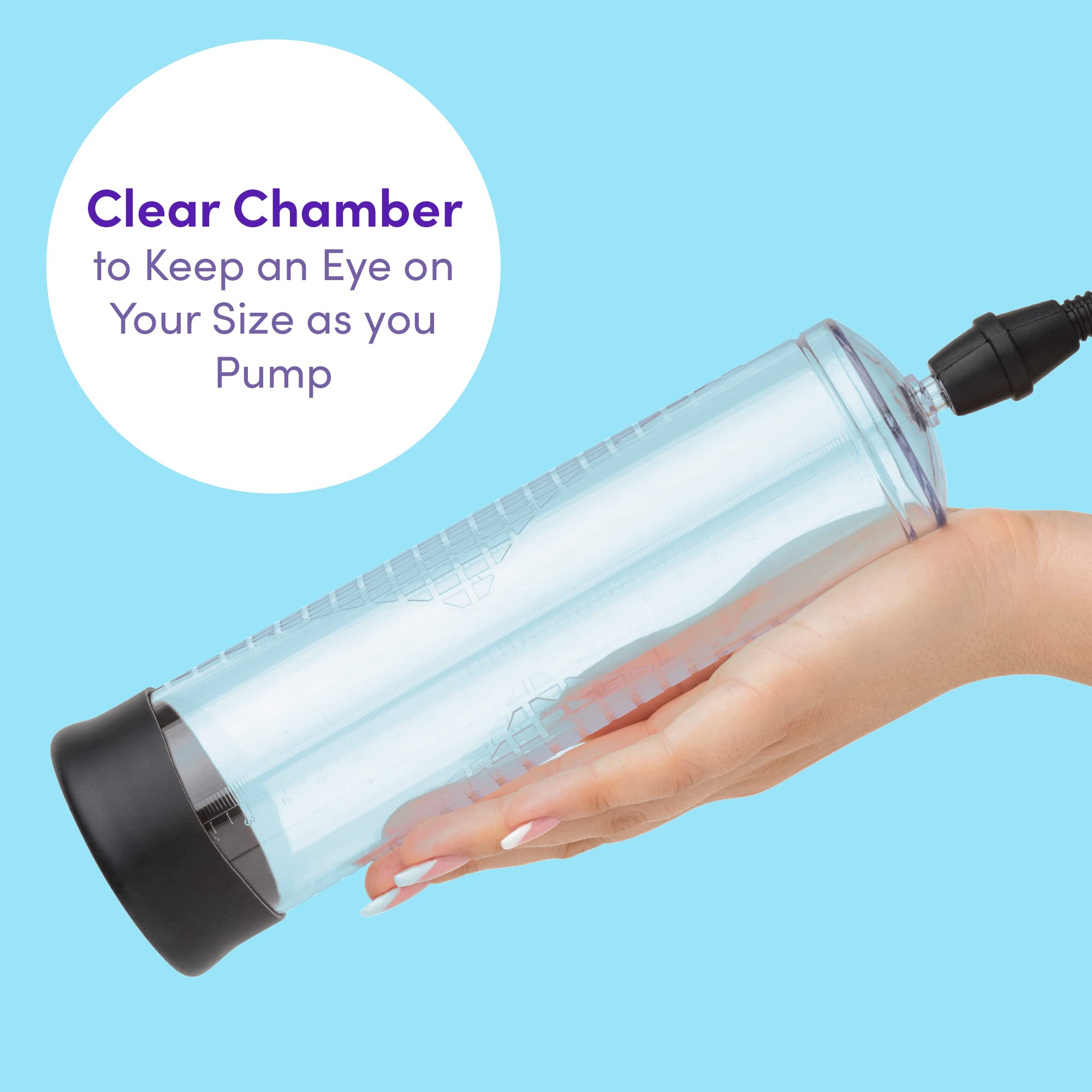- CLEAR CHAMBER TO KEEP AN EYE ON YOUR SIZE AS YOU PUMP: Enjoy the sensational feeling as the suction increases with every pump. To end your workout session, simply press the quick release button on the pump to release the air pressure.